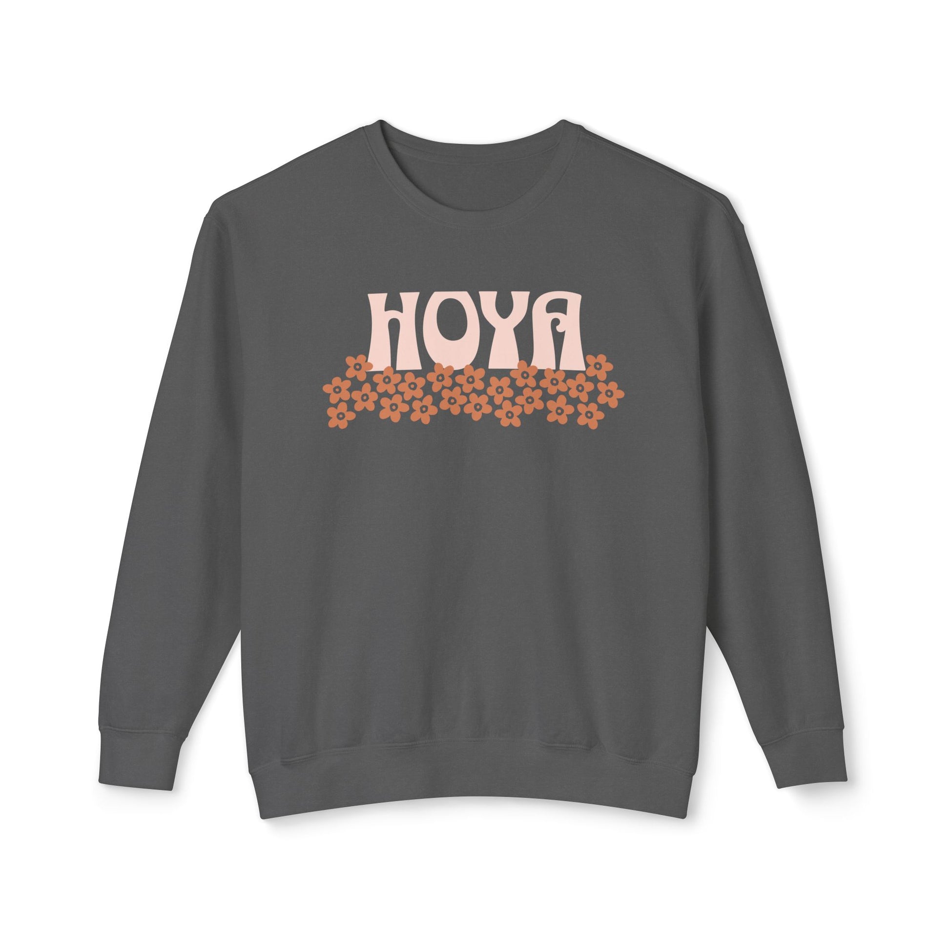 A unisex lightweight crewneck sweatshirt featuring the word "Hoya" underlined by flowers. This sweatshirt gives off a cozy and casual vibe, perfect for everyday wear or a relaxed outing with friends. Ideal for those who appreciate floral designs and want to add a touch of nature to their wardrobe. Great for casual gatherings, nature lovers, and those who enjoy a comfortable yet stylish look.